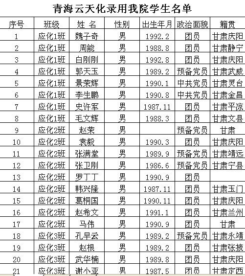 青海云天化录用公司员工名单