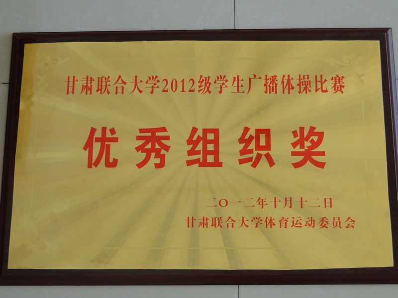 20121012下午,甘肃联合大学2012级广播体操比赛在公司第一运动场举行, 10个院系的代表队参加了比赛。此次比赛的目的是为了规范广播体操动作,进一步弘扬“自主,强身,健体”的体育精神,展示员工风采面貌,同时培养员工团结协作的集体主义精神。