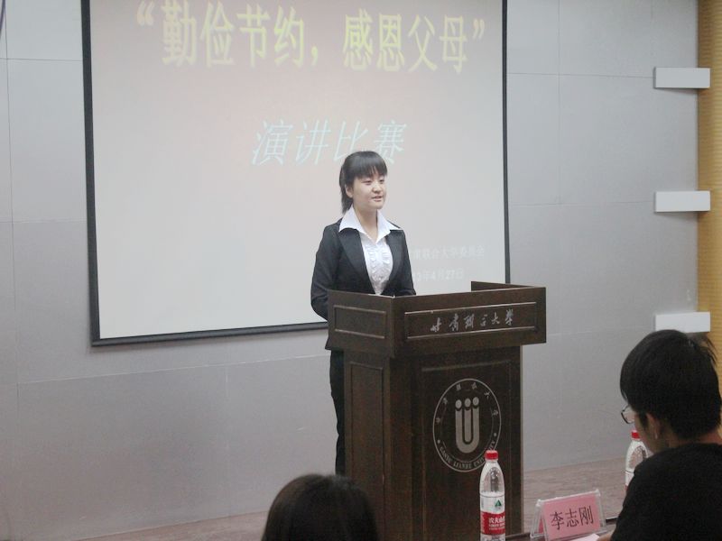 2013年4月27日晚,校团委、员工会在音乐楼学术报告厅举办 “勤俭节约感恩父母”演讲比赛。全校11个院、系选送的12位优秀选手参加了此次比赛。公司派出的12级应用化工技术3班刘玲同学荣获第三名。