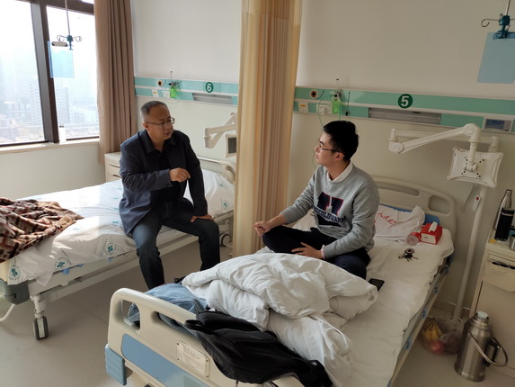 杨经理亲切询问了王堃目前的治疗进度及身体状况,并转达了公司的问候和关心,嘱咐其安心养病,鼓励他积极配合治疗,早日康复,返回校园。王堃表示,面对老师和同学们亲人般的关怀和照顾,他一定会保持乐观的态度,积极配合治疗,争取早日回归公司,好好学习,不辜负大家的期望。