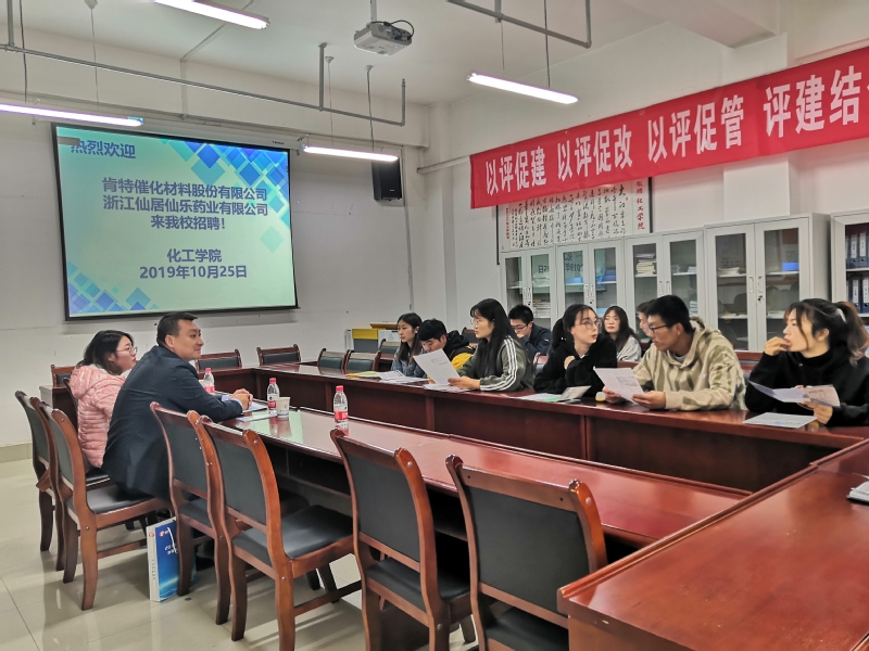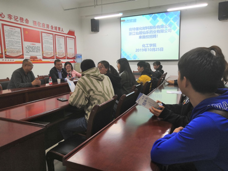 10月25日,浙江肯特催化材料股份有限公司和浙江仙居仙乐药业有限公司来公司开展校园招聘,招聘会在公司会议室举行,16级本科生参加了本次招聘。