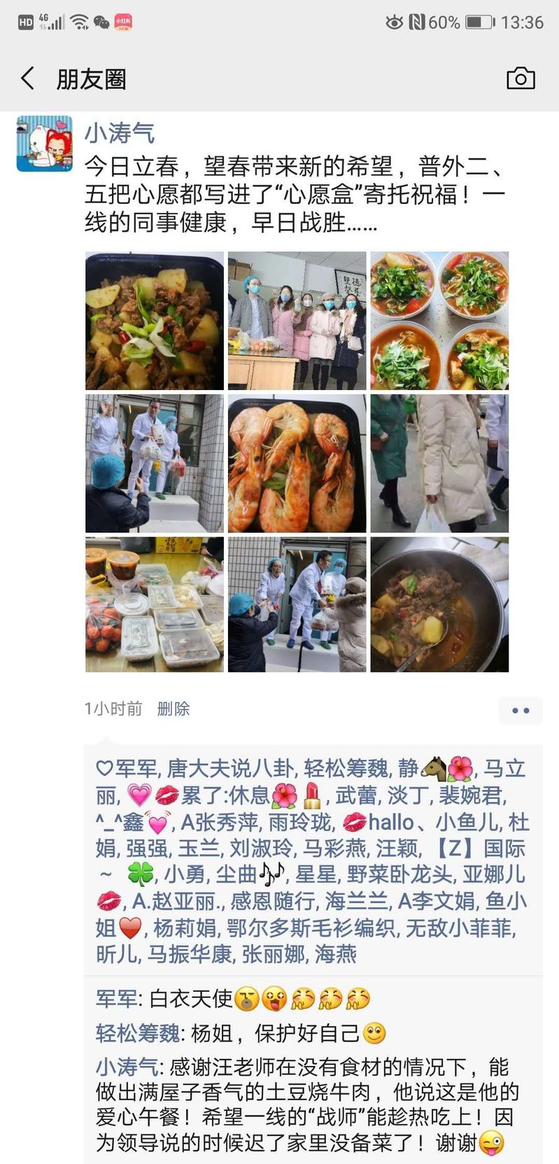 公司教师汪建义的妻子杨淑涛是兰大一院的一名主管护师,连日来奋战在抗疫一线,汪老师自发为兰大一院全体医护人员制作爱心餐食,在缺少食材的情况下,汪老师尽力做出丰富多样的菜品,包饺子,做春饼,将爱心送到每一位医护人员的手中,为一线战士做好后勤保障工作;此外,汪老师自觉处理好家庭内务,照顾好老人和孩子,做好妻子的后盾。