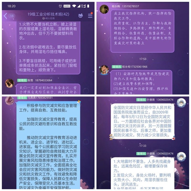 公司通过QQ班级群、微信宣传等方式,加强开展 “防灾减灾日”宣传,全院各班级利用腾讯会议APP开展防灾减灾主题班会,普及洪涝、地震、风雹等各类灾害以及公共卫生安全、生产安全、火灾、燃气泄漏等事故的知识和防范应对技能,提高员工的自救自护能力。各班通过开班会,制作手抄报,撰写学习心得等方式加强同学们对防灾减灾安全的认识。同时公司利用公司官网加强和普及防震减灾相关知识,学习发生灾害时如何进行自我保护、预防的常识和技能。