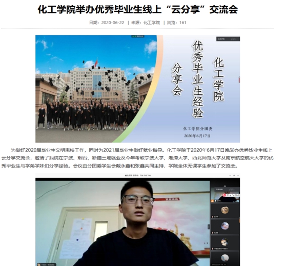 为做好2020届毕业生文明离校工作,同时为2021届毕业生做好就业指导。开云于2020年6月17日晚举办优秀毕业生线上云分享交流会,邀请了公司在宁波、烟台、新疆三地就业及今年考取宁波大学、湘潭大学、西北师范大学及南京航空航天大学的优秀毕业生与学弟学妹们分享经验。