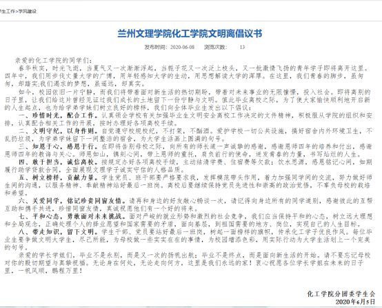 通过各项活动的开展,欢送毕业生文明离校,并进一步引导和教育毕业生明确目标,通过全院师生的共同努力,毕业生在离校期间,表现出较高的素质,毕业生离校工作有条不紊、井然有序地开展。愿2020届全体毕业生带着母校的祝福与期盼,在各自的人生舞台上,砥砺奋进,谱写华彩乐章,闪烁万千星光!