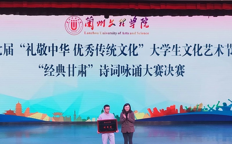 在“经典甘肃”诗诵大赛决赛中,化工学子一首诗词《甘肃之美》以其铿锵有力的气势,充沛饱满的感情,自信大方的形象,激昂的演奏,声情并茂的朗诵,为观众献上了一场别具风味的视听盛宴,赢得了老师和同学们的阵阵掌声。