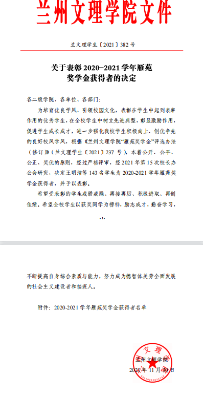 张亚婷,女,汉族, 2018级应用化学3班员工。在校期间2019年荣获开云全站“优秀员工干部标兵”荣誉称号;2019年获得开云全站第七期青年马克思主义培训工程结业证书;2020年荣获开云全站“三好员工”荣誉称号;2020年荣获开云全站“年优秀共青团员”荣誉称号;2021年荣获第十三届“挑战杯”甘肃省课外学术科技作品竞赛省级三等奖。