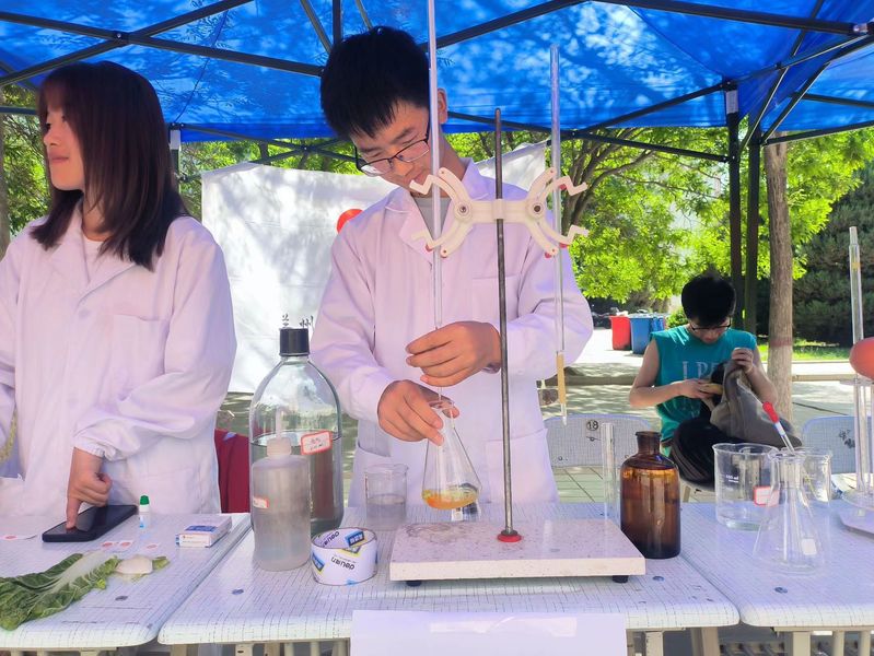 活动中,社团负责人首先向同学们介绍了实验展示活动中应注意的安全问题,讲述了化学和人们日常生活的密切关系,鼓励同学们以积极探索的心态参与实验。随后,参与实验的同学们展示了水的硬度检测、水的酸碱性检测和蔬菜中的农药残留等实验项目。在一个又一个有趣的化学实验过程中,实验的同学详细讲解了实验原理,让同学们更直观地感受到化学实验的魅力,体会到科学的乐趣。