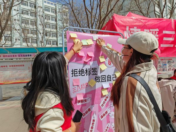 “女生只适合学文科”“要瘦才漂亮”“漫画腿”“头发长见识短”“女司机”……志愿服务队的同学们在海报上列出很多社会对女性固有的印象。活动中,路过的同学一个个撕掉那些强加在女性身上的标签,再用新的便利贴写下激励自己的语句,给接下来参加的每一位同学送上美好的祝愿。不断有更多的员工被这种氛围所感染,在海报上、横幅上留下自己的签名和祝福。