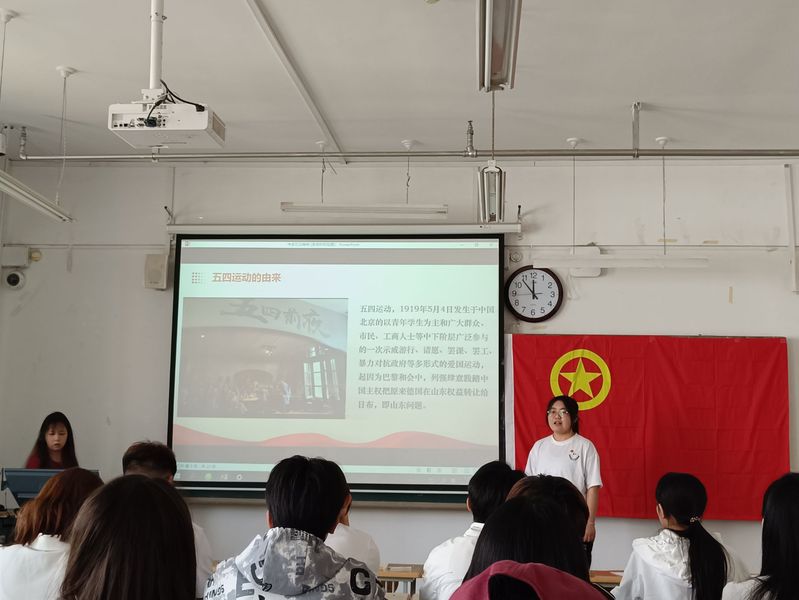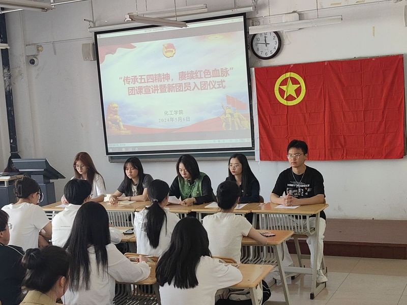 活动在唱中国共产主义青年团团歌中开始。分团委负责人宣读了新发展团员名单,为新团员佩戴了团徽,15位新团员在团旗下庄严宣誓,正式加入中国共产主义青年团。团课宣讲环节,在宣讲人的带领下,与会人员一起回顾了“五四运动”的历史背景、主要经过,深刻领悟“五四运动”在中国历史发展进程中的重要意义。