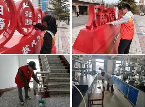 活动伊始,志愿者们齐聚思源楼广场,随后迅速奔赴教室、楼道、实验室、校园等区域,开启了一场热火朝天的清洁行动。在教室里,他们精心清洁墙面,摆放桌椅,使教室秩序井然。在实验室中,他们认真清理台面,整理试剂瓶,确保实验环境整洁有序。在楼道内,他们用心擦拭扶手、清扫垃圾。在校园里,他们擦拭宣传标语牌,使其清晰醒目。