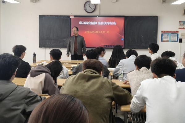 班会紧扣政府工作报告与习近平总书记重要讲话精神,结合权威媒体解读,系统梳理“十五五”规划关于教育强国、科技创新、绿色化工等战略部署。各班班主任以专题讲解、案例剖析等形式,深入阐释新质生产力、低碳技术、高端化学品研发等政策要义,引导化工学子立足专业优势,在“双碳”实践、绿色化工技术攻关中勇挑重担,把两会精神转化为科研报国的实际行动。